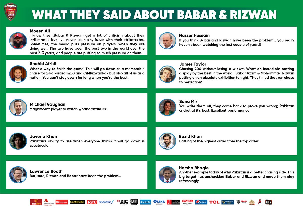 What they said about Babar and Rizwan's phenomenal partnership <br/> <br/><span class="tag"><a href="https://twitter.com/search?q=%23PAKvENG">#PAKvENG</a></span> | <span class="tag"><a href="https://twitter.com/search?q=%23UKSePK">#UKSePK</a></span> <span class="link"><a href="https://t.co/M8d68huv39">https://t.co/M8d68huv39</a></span>